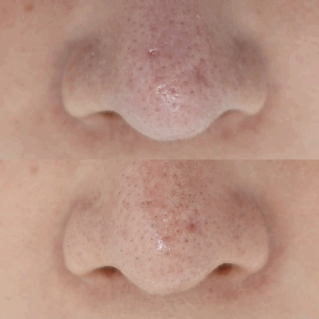 当院ではレニスナを薬剤として使用したキュアジェットをへこみに接触照射で2回、1カ月間隔で行い、鼻全体の毛穴には中空照射を2回目のみ併用して1回行い、最後の施術から3カ月後の写真です。