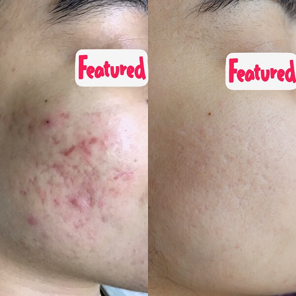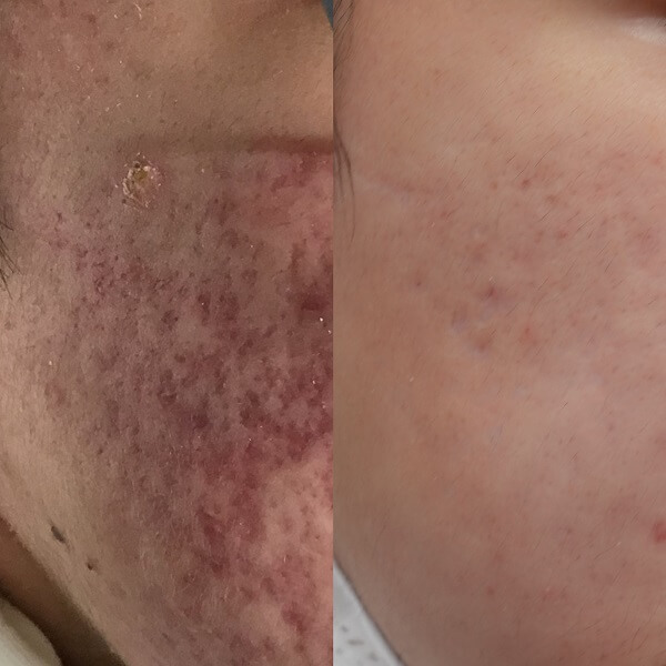 | 治療内容 | 繰り返すニキビとニキビ跡でお悩みだった20代女性の患者様。施術前の画像(左)では、右の頬全体に赤みのあるニキビとクレーター状のニキビ跡が確認できます。 ダーマペン4による施術を9回受けた3カ月後には、画像(右)のようにニキビ・ニキビ跡が目立ちにくくなりました。 |