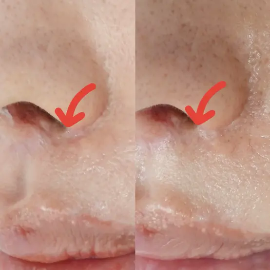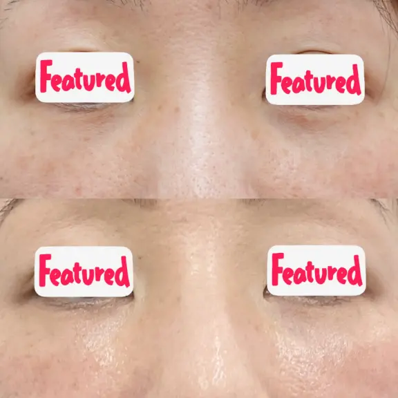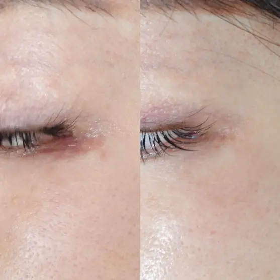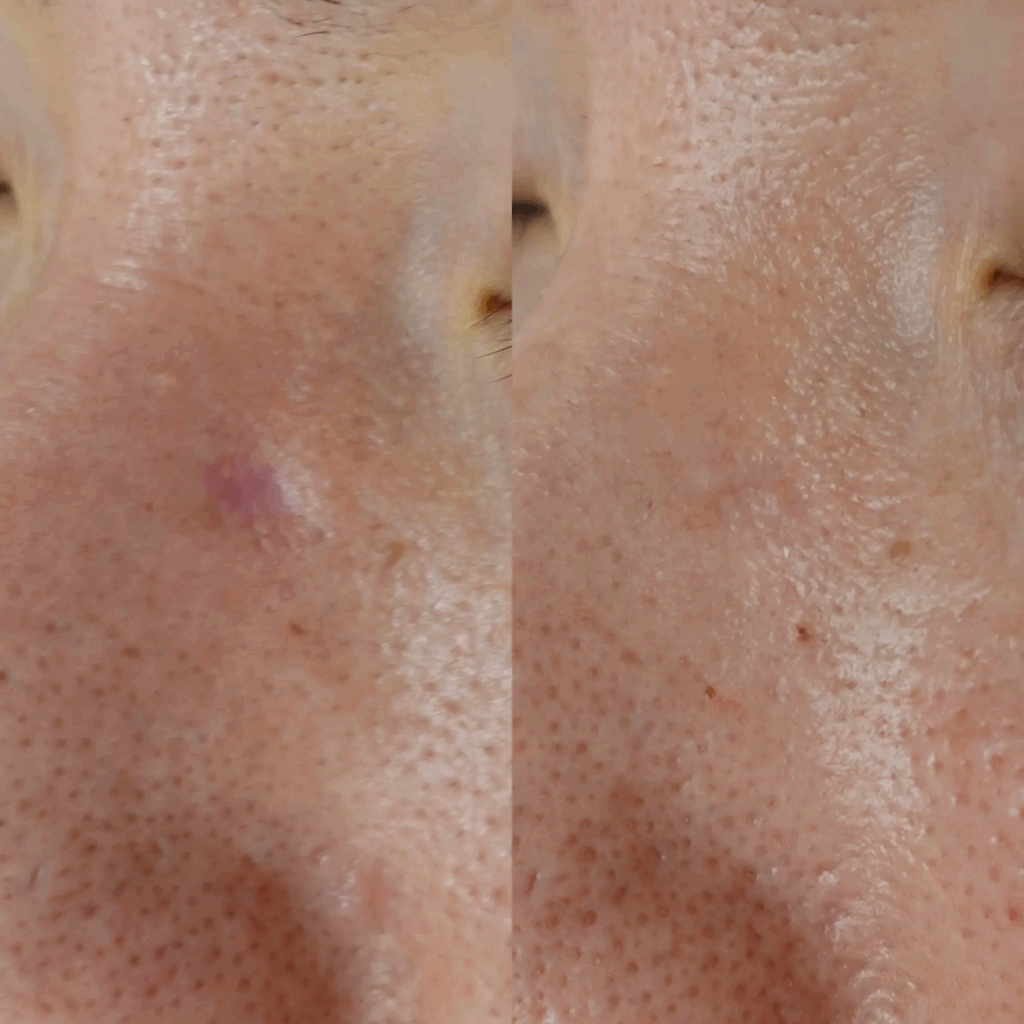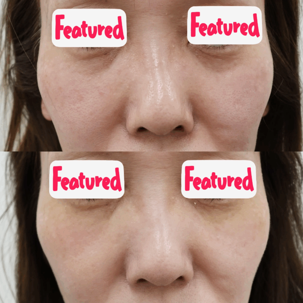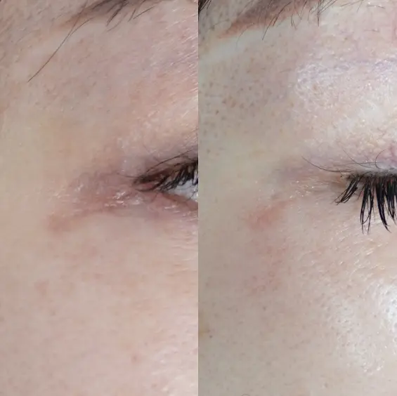 他院での人柱短縮と目尻のオペ後の傷跡でお悩みだった当院の30代女性の患者様の症例です。目尻は皮膚が薄くなり血管が透けて赤くなった状態、鼻下は小さなへこみが目立つ状態でした。