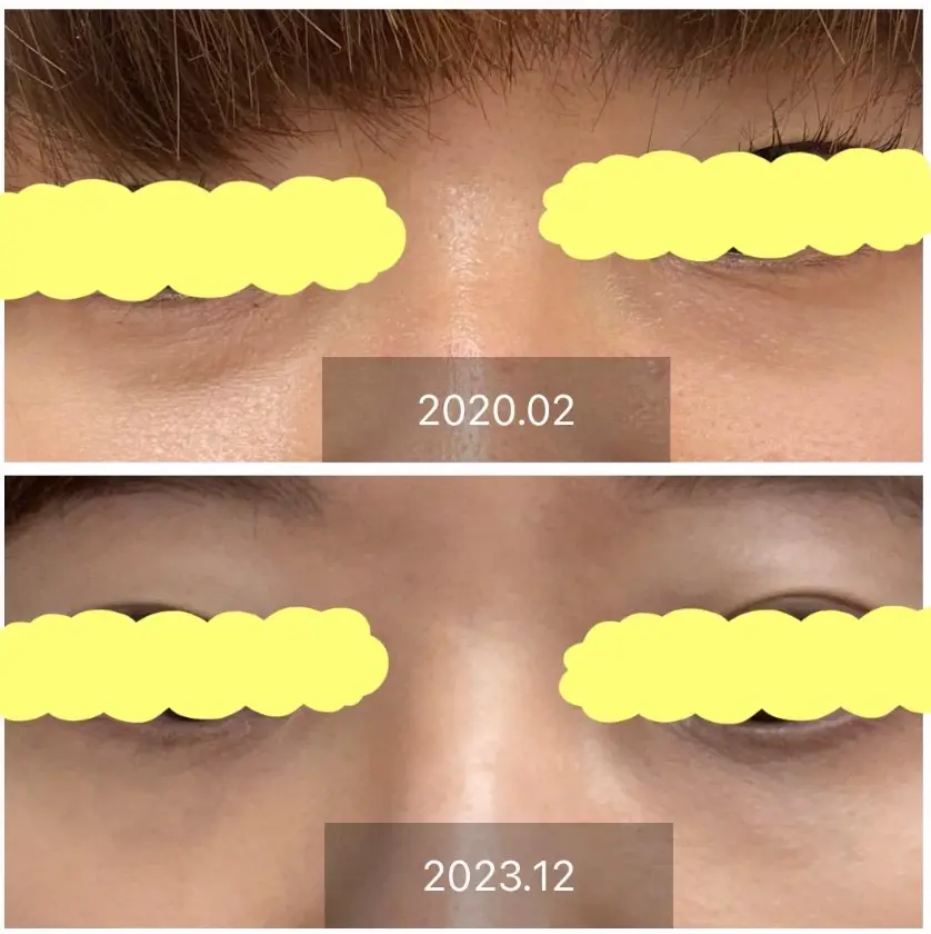 担当医師コメント | この患者様のように「リジュランアイ」と「医療ハイフ」を併用することで相乗効果が期待できます。4年近くたち、年令による変化があるにもかかわらず、目の下のボリューム、はり、小じわともに改善しているのがわかります。 「リジュランアイ」には即効性はなく、線維芽細胞が活性化されてコラーゲンなどの肌成分が作られはじめてから、少しずつ肌状態の変化を感じやすくなる施術です。繰り返しリジュランアイの施術をすると、目の下にボリュームを与える働きが期待できます。 「医療ハイフ(HIFU)」は、高密度な超音波を肌に照射することで、コラーゲンを作られやすくして小ジワやたるみにアプローチする施術です。当院では「ソノクイーン」という機種を導入しており、3種類のカートリッジによって超音波を照射する深さが調整できます。従来の機種では対応が難しかった目元周辺の肌トラブルにも対応できる施術です。 |