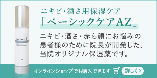 当院では酒さやニキビ、乾燥肌などでお悩みの方向けに「ベーシックケア」シリーズを販売しています。化粧水にはアゼライン酸誘導体とナイアシンアミドを配合し、過剰な皮脂分泌を抑えてニキビのできにくい肌へ導きます。また乳液はさらに保湿成分のセラミドを配合し、酒さや赤ら顔、ニキビなどでお悩みの方に適しています。
