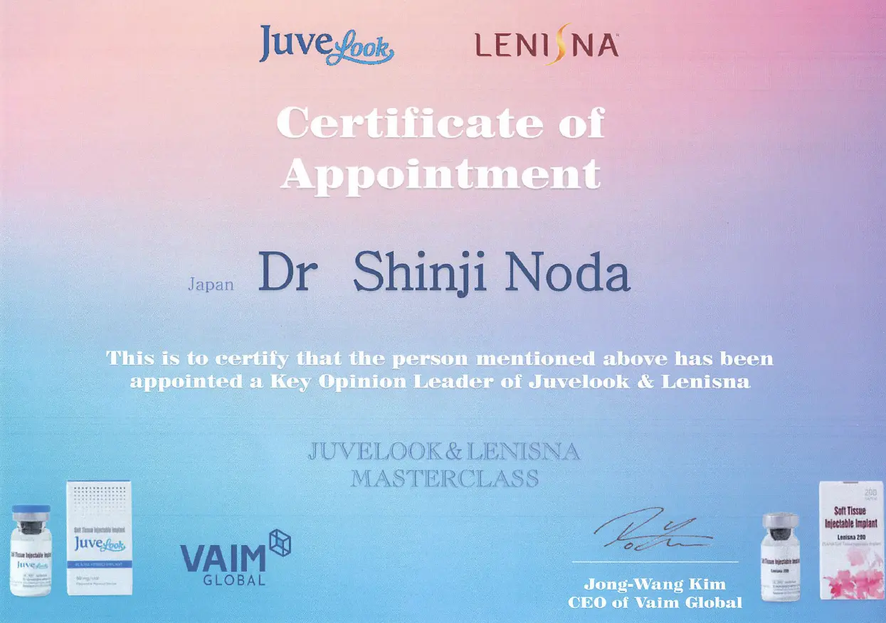 当院はジュベルック施術の症例数が豊富で結果も出してきています。そのため院長はジュベルックの開発元の韓国VAIM社から日本のkey opinion leader(KOL、業界のリーダー)と認定され、韓国での研修も受けました。